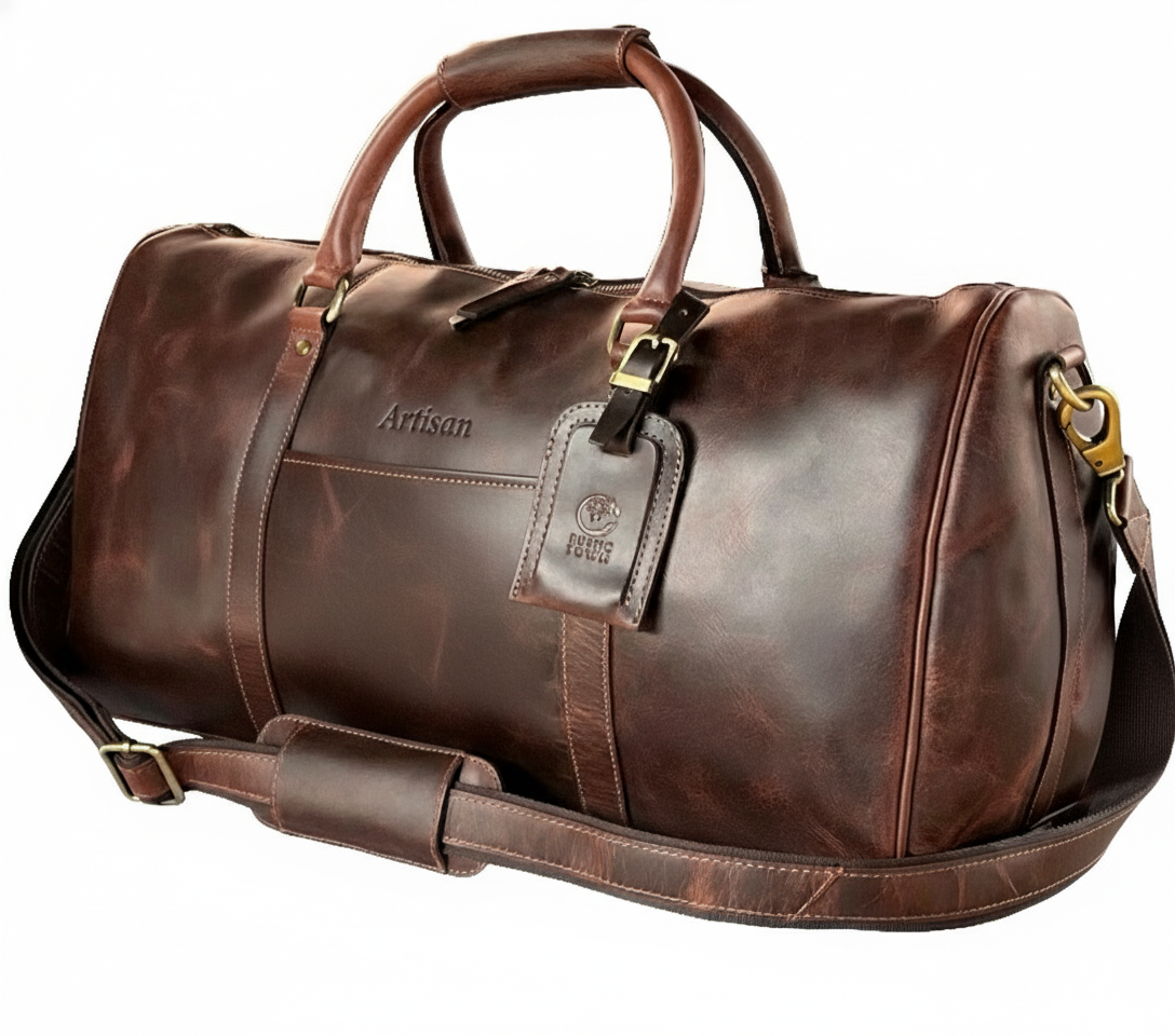 Introducing the ultimate style partner for life: our Full Grain Leather Duffle Bag for men. Crafted with precision and reinforced stitching, this bag is not just a travel companion; it’s a lifelong confidant. Made from premium leather, it ages gracefully alongside you, developing unique patterns that mirror your journey. Say goodbye to travel woes with our Perfect Carry-On. Designed to meet domestic and international airline size requirements, it effortlessly fits into overhead cabins and under seats. With dimensions of 20″ x 11.5″ x 9″ inches, it’s your ideal companion for 3-day trips. Structure meets sophistication in our leather weekender bag for men. Thoughtfully organized pockets cater to your every need, storing accessories with ease. Featuring 1 Inner Zip Pocket, 4 Card Slots, 2 Pen Loops, and 1 Mobile Pocket, it keeps you organized on the go.